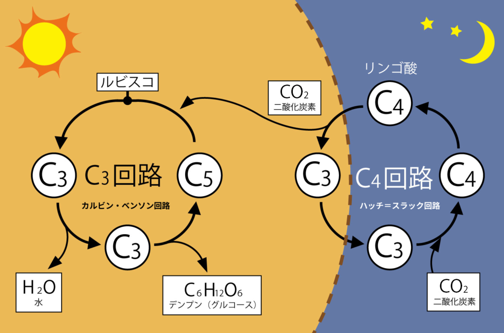 光合成は「カルビン・ベンソン回路(C3回路)」というシステムによって行われます。このシステムは太陽光を利用しているので、多くの植物は日中に気孔と呼ばれる葉の表面の穴を開いて二酸化炭素を取り込もうとします。しかし、乾燥した場所では、暑い日中に気孔を開くと体内の水分もどんどん蒸発してしまいます。